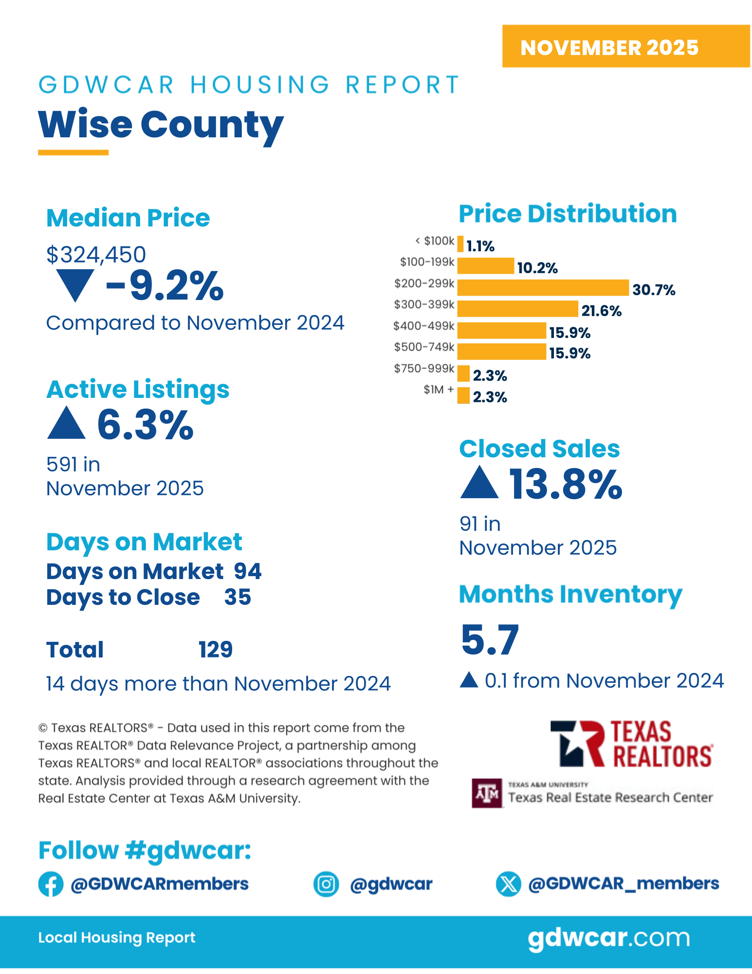 DENTON, TEXAS — (December 8, 2025) — November 2025 housing reports are now available. Greater Denton/Wise County Association of REALTORS® reports increased inventory across North Texas with cities such as Corinth (+100%) and Aubrey (+60%) leading the surge. Most areas saw price declines year-over-year, with notable drops in Montague County (-53.6%) and Bowie (-55.4%). Some areas like Corinth (+18.6%), Gainesville (+10%), and Ponder (+10.5%) experienced price increases.