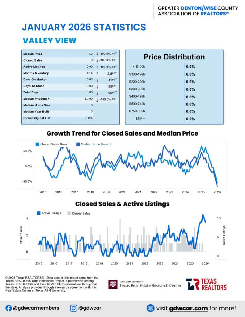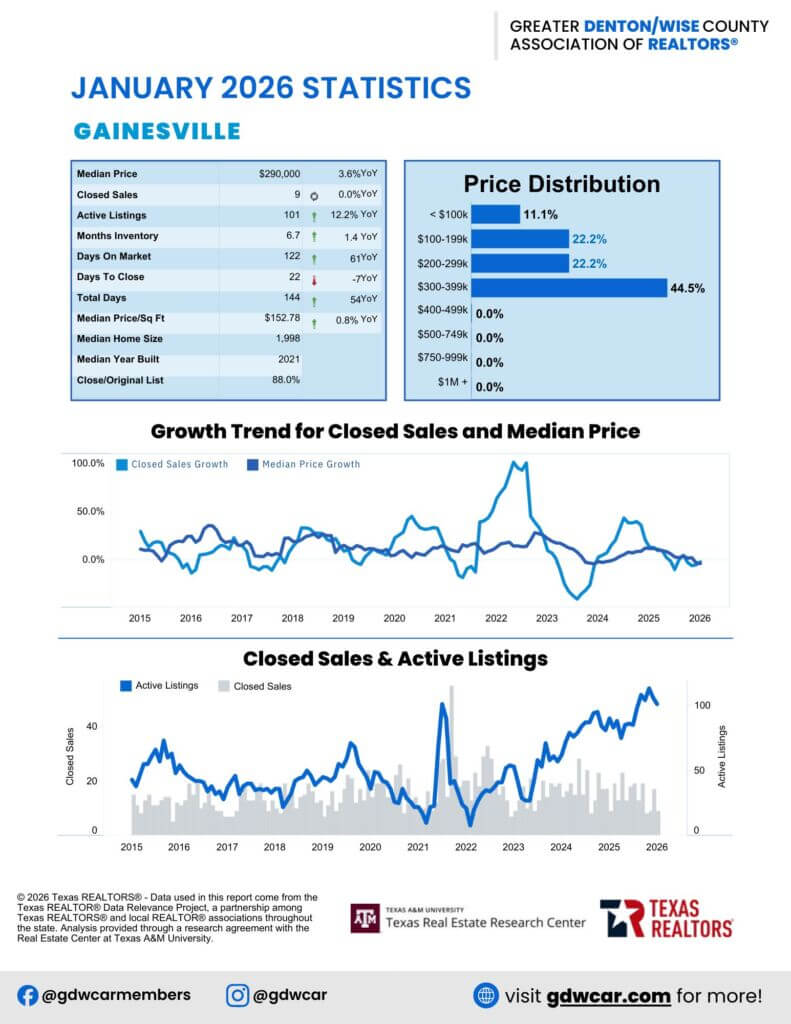 DENTON, TEXAS — (March 11, 2026) — February 2026 housing reports are now available. Greater Denton/Wise County Association of REALTORS® reports increased inventory across North Texas with cities such as Corinth (+100%) and Aubrey (+60%) leading the surge. Most areas saw price declines year-over-year, with notable drops in Montague County (-53.6%) and Bowie (-55.4%). Some areas like Corinth (+18.6%), Gainesville (+10%), and Ponder (+10.5%) experienced price increases.